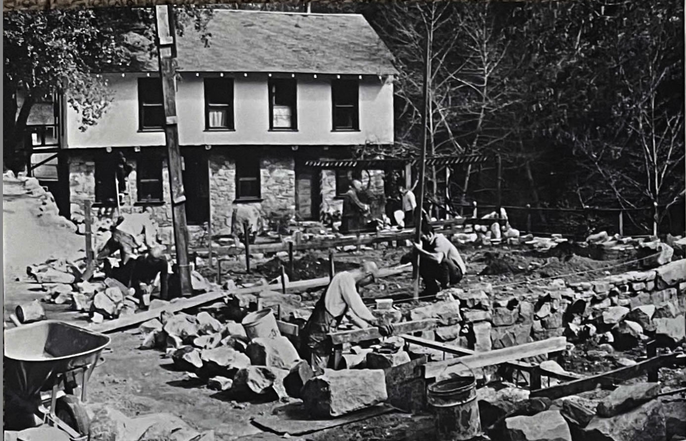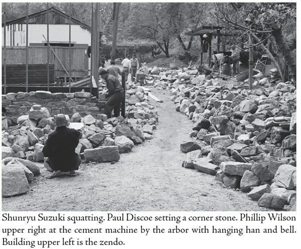 Paul Discoe center front, Dan Welch on left, Peter DiGesu holding pole, Shunryu Suzuki in back left of unknown student. - photo by Tim Buckley